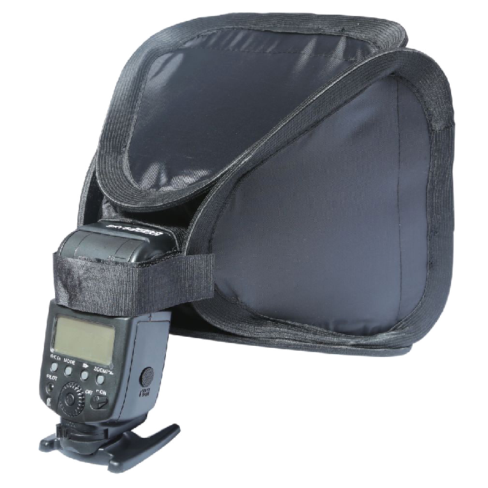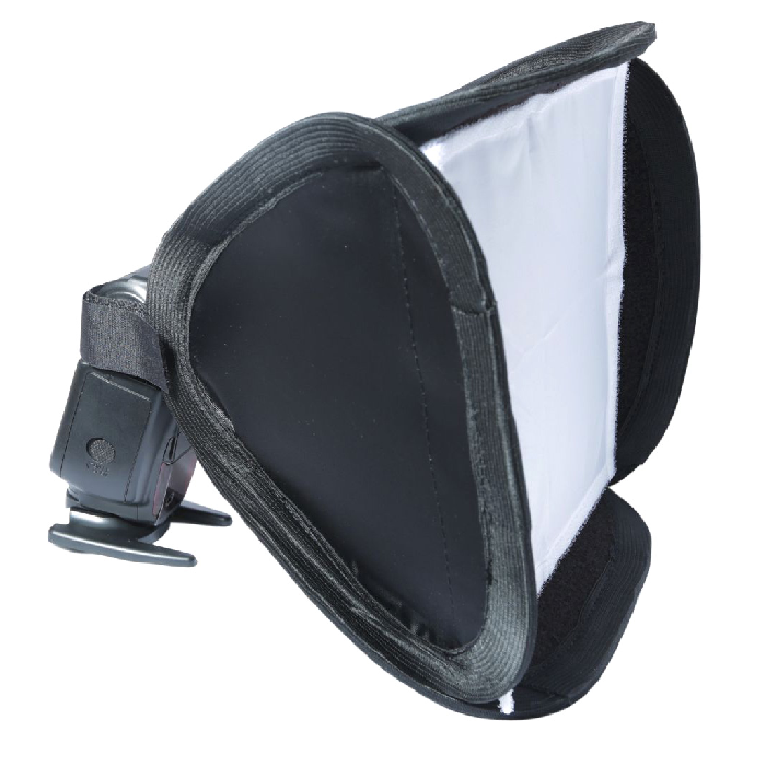 Удобное крепление на резинке-липучке позволяет использовать софтбокс с любыми внешними вспышками.