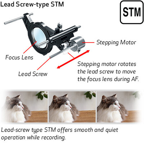 - Наличие привода автофокуса STM с ходовым винтом. Это позволяет быстро перефокусировать камеру, что особенно полезно при съемке динамических объектов. Привод тихий, поэтому при видеосъемке никаких посторонних звуков в ролике не будет.