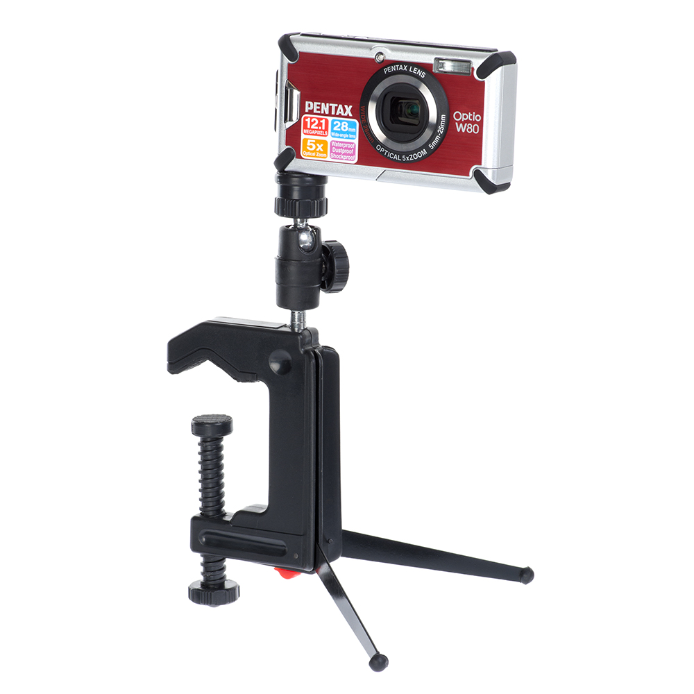 Штатив и винтовой зажим изготовлены из прочного пластика, ножки и шаровые секции головки — алюминий.