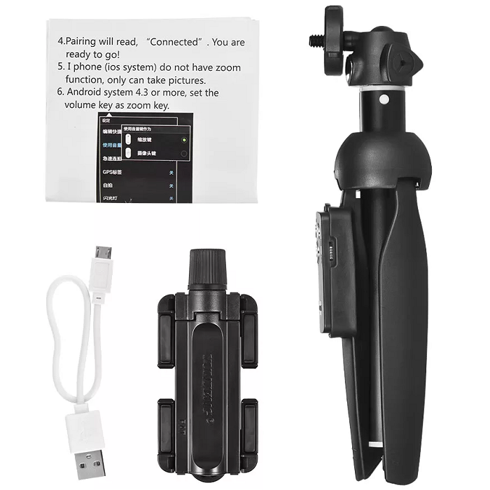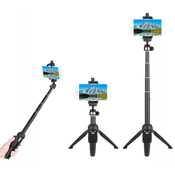 Модель Yunteng YT-9928 сочетает в себе сразу два необходимых для съёмки на смартфон устройства: это телескопический селфи-монопод для любителей автопортретов и полноценный штатив для съёмки окружающих с помощью основной камеры смартфона. В комплект также входит пульт дистанционного управления.