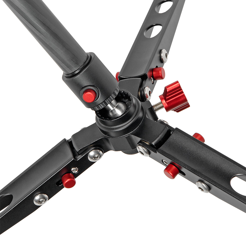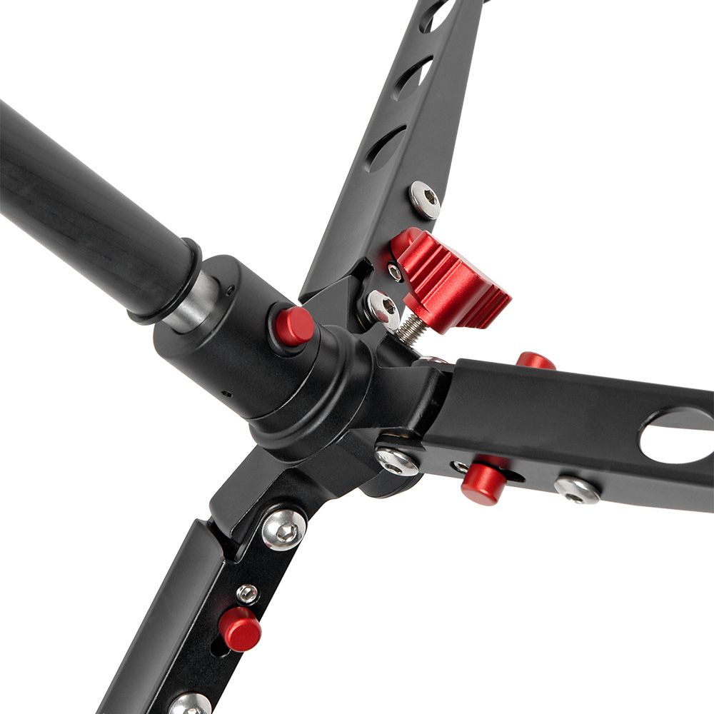 Четыре секции из карбона с клипсовыми зажимами из ABS пластика. Диаметр секций — 32, 28, 25, 22 мм. При ослаблении клипсового фиксатора — возможна регулировка зажима винтом под шестигранный ключ. На верхней секции предусмотрены: накладка-рукав из вспененного материала для комфортного удержания монопода в холодное время года и кистевой ремень для удобства удержания монопода рукой. Круглая площадка верхней базы монопода имеет реверсивный винт 1/4" - 3/8", на который крепится видеоголовка, а при необходимости непосредственно камера. Пузырьковый уровень находиться на круглой площадке и имеет возможность вращаться вокруг центральной колонны.