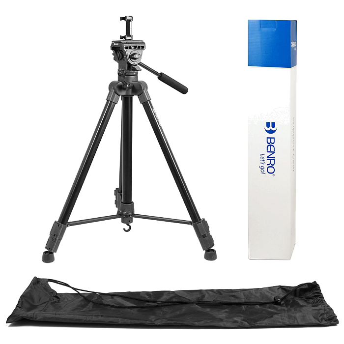 Компактный и легкий трехсекционный алюминиевый штатив с универсальной головой для фото и видеосъемки.