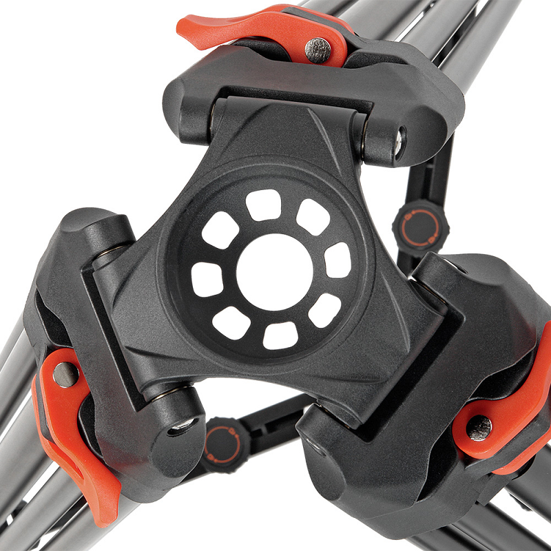 Ножки штатива вилочного типа. Секции ног надежно фиксируются клипсовыми замками. При ослаблении клипсового фиксатора — возможна регулировка зажима винтом с обратной стороны клипсы. Шестигранные ключи для регулировки в комплекте.